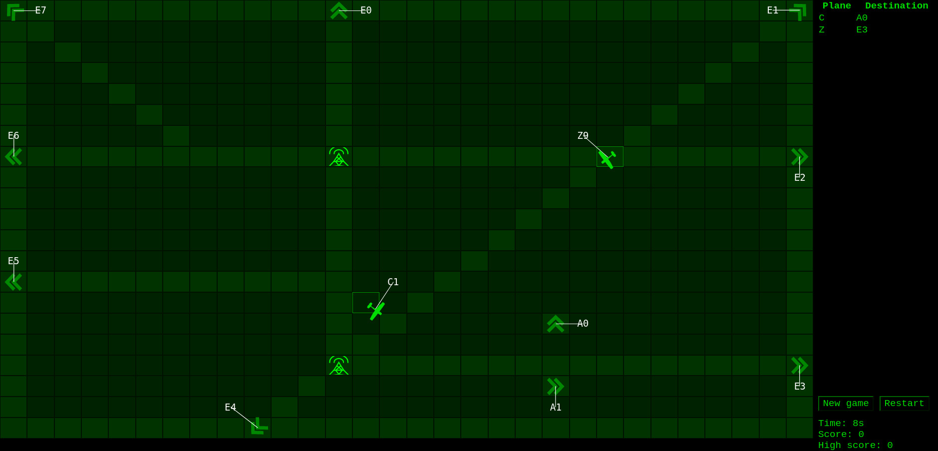 My remake of Ed James' Air Traffic Control game (a part of bsdgames package.) I wrote it to learn JavaScript, and the 'learn' part is quite noticeable ;) My high score is Time 972, Safe 158.