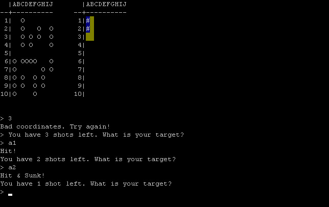My command line version of the old Battleships pen & paper game. It features a computer opponent with 4 levels of difficulty. It uses Windows API to enable advanced command line features like colors. Licensed under GPL.